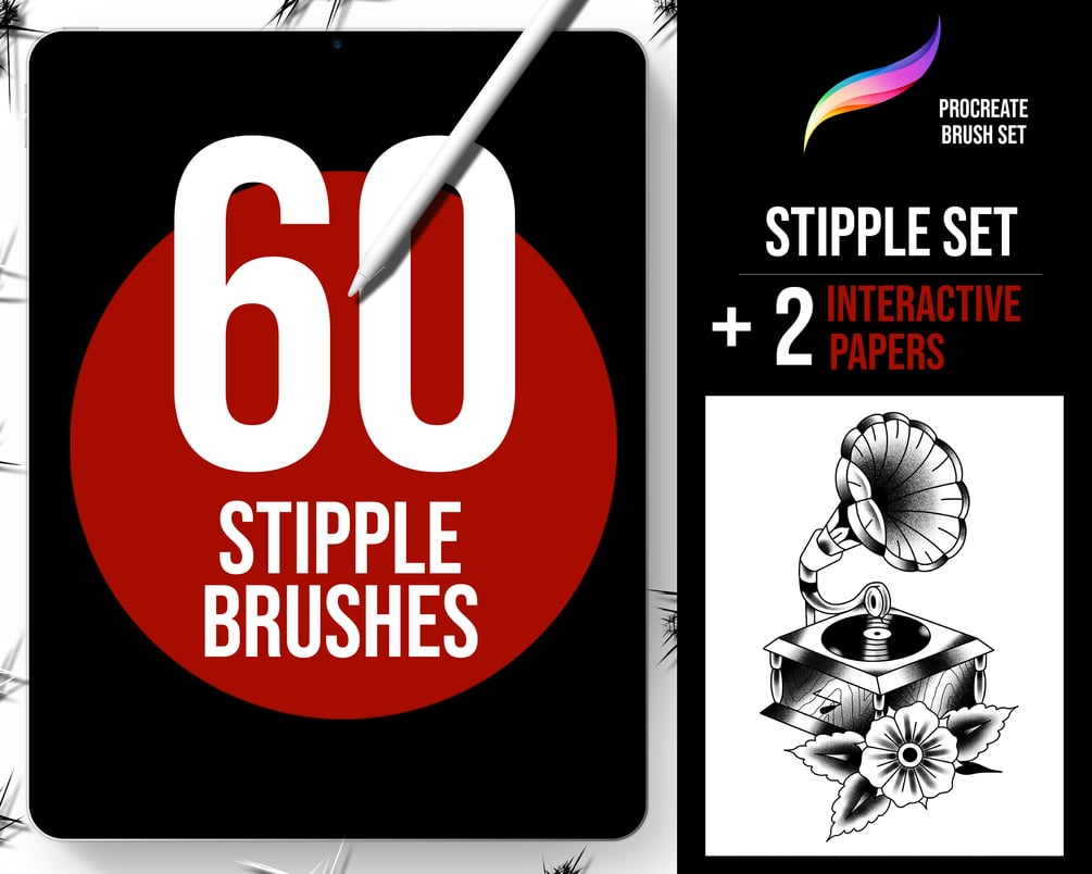 60 Hand Rendered True Stipple Shading Brushes + 2 Interactive Papers