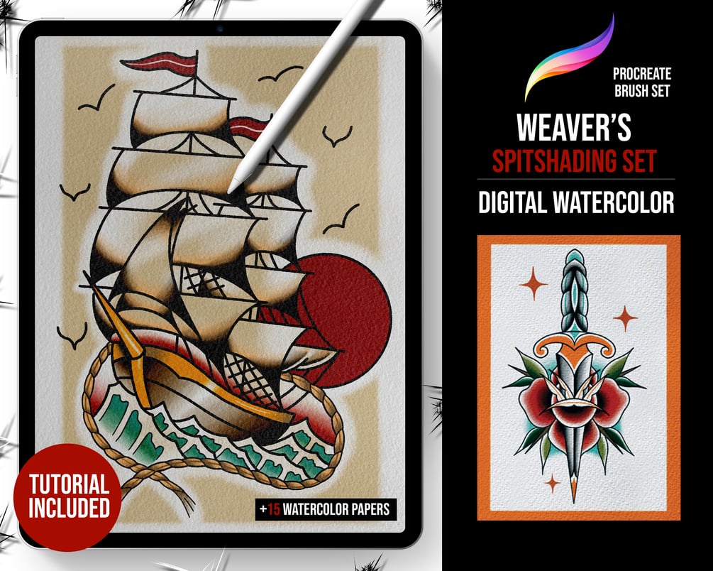 Weaver's Spitshading Set (digital watercolour set) This kit includes 11 300dpi watercolour paper canvasses and 23 brushes, Liners, markers, shaders, sketch pencil and water blenders that enable artists to design and paint in a traditional watercolour manner, specifically the 'spitshading' method, used by tattoo artists for many years. These procreate tattoo brushes are a must have.